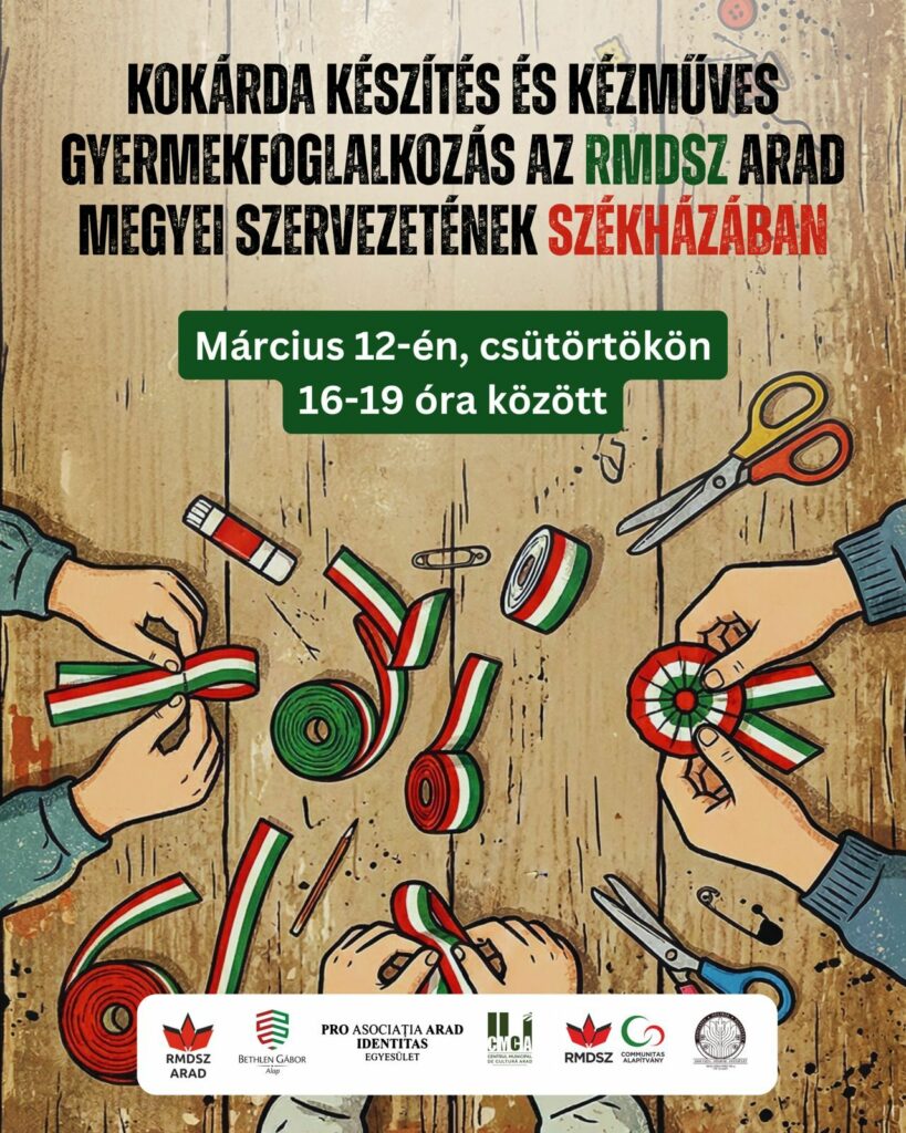 Az RMDSZ Arad Megyei Szervezetének székházában kokárdakészítésre várjuk a kicsiket és nagyokat, illetve sok más kézműves tevékenységgel is készülünk.